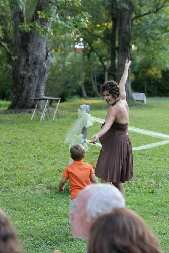 I'm pregnant, again, and it is a bright August day. The wedding and reception are outdoors and I'm there with little Magnus (he's almost three) and we are dancing.
